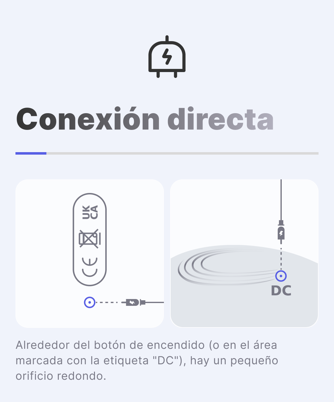 Conexión directa: Alrededor del botón de encendido (o el área marcada con una etiqueta "DC"), hay un pequeño agujero redondo.