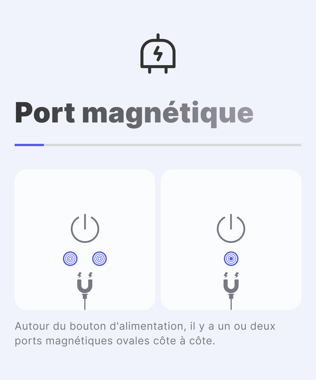 Port magnétique : Autour du bouton d'alimentation, il y a un ou deux ports magnétiques ovales côte à côte.